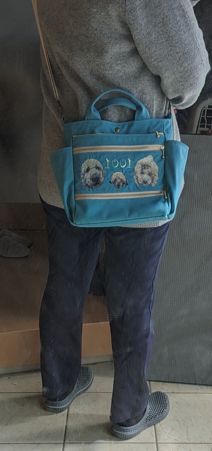 うちの子を刺繍したポケットいっぱいのショルダーバッグです。