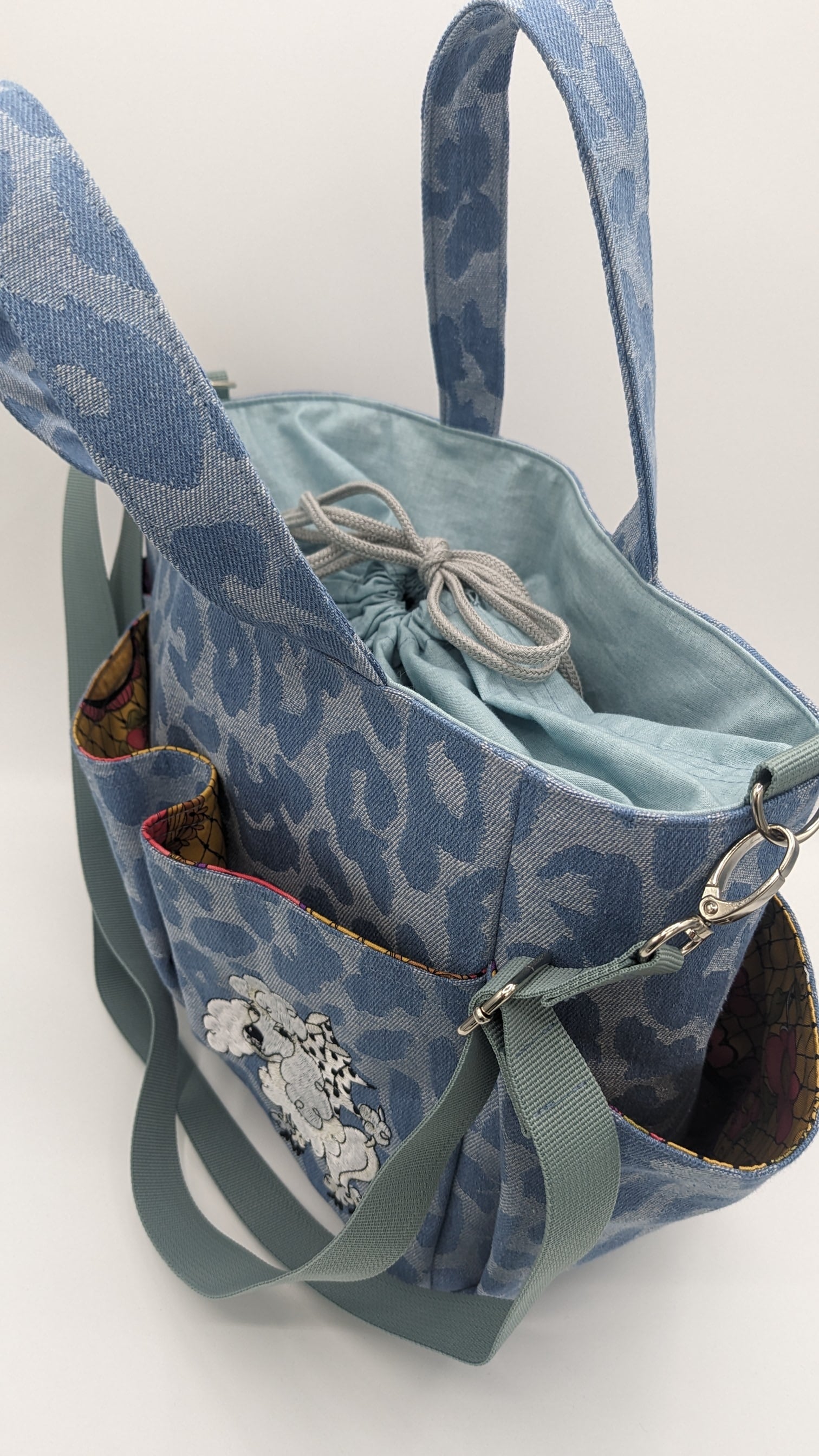 うちの子を刺繍したポケットいっぱいのショルダーバッグです。
